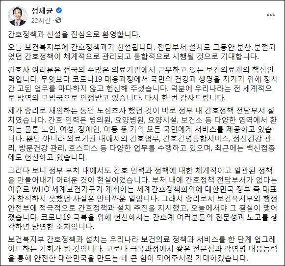 정세균 전 국무총리는 11일 페이스북을 통해 먼저 “간호정책과 신설을 진심으로 환영한다.”며 “오늘 보건복지부에 간호정책과가 신설된다.”고 전하면서 “전담부서 설치로 그동안 분산․분절되었던 간호정책이 체계적으로 관리되고 통합적으로 시행될 것으로 기대한다.”라고 말했다.