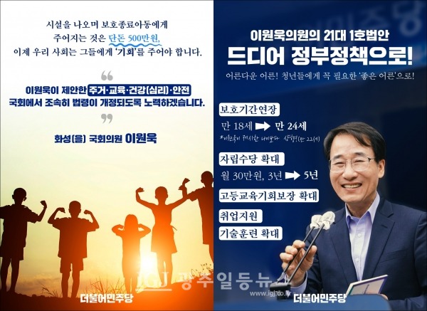 [광주일등뉴스=기범석 기자] 이원욱 국회 과학기술정보방송통신위원장(더불어민주당, 경기 화성시을)은 제21대 국회 제1호 법안인 「아동복지법」 개정안(좋은 어른법)의 내용이 13일(화) 국무조정실 등 관계부처 합동으로 발표한 「보호 종료 아동 지원강화 방안」에 반영됐다고 밝혔다.