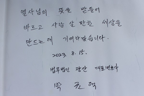 추모식에 참석한 박 변호사는 “열사님의 뜻을 받아 바르고 사람 살 만한 세상을 만드는 데 기여하겠습니다”라고 방명록을 남긴 뒤 유가족과 인사하며 열사를 추모했다.
