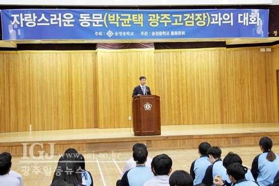 박균택 광주고등검찰청 검사장은 송정중학교 후배들과 대화의 시간에 참석해 ▲현재 시기를 소중하게 생각하기 ▲꿈을 크게 갖기 ▲공부하는 자세 ▲바른 심성갖기 ▲환경 탓하지 말고 긍정의 마음 갖기를 강조했다.