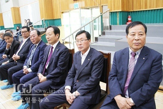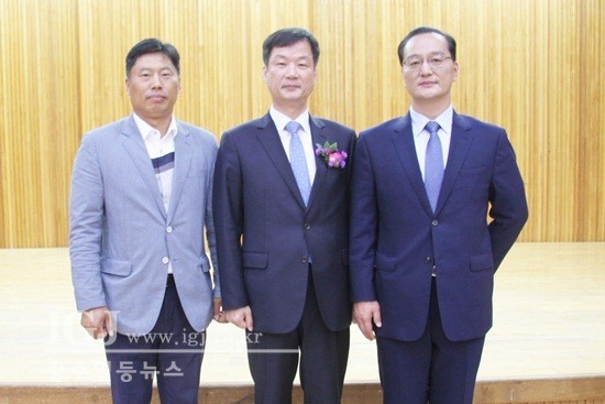 박균택 광주고등검찰청 검사장, 기재만 임곡농협조합장(동문)은 송정중학교 자랑스런 동문 ‘박균택 광주고검장’과의 대화의 시간을 마친 후 "후배들에게 자랑스러운 선배가 되도록 최선의 노력을 다하겠다"며 기념촬영