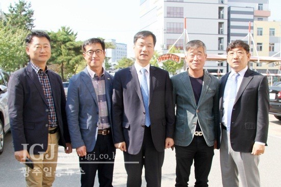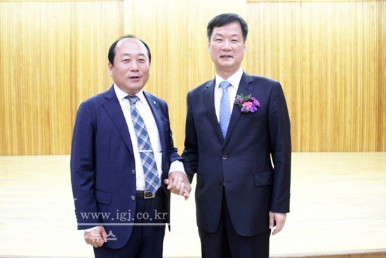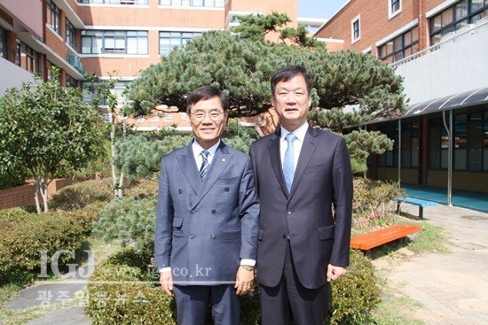 박균택 광주고등검찰청 검사장, 나왕수 하남농협조합장(동문)은 송정중학교 자랑스런 동문 ‘박균택 광주고검장’과의 대화의 시간을 마친 후 "후배들에게 자랑스러운 선배가 되도록 최선의 노력을 다하겠다"며 기념촬영