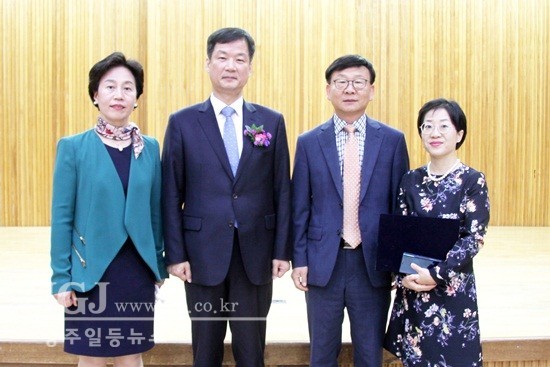 박균택 광주고등검찰청 검사장, 서기화 송정중학교교장, 최성은 교감, 김현화 교무기획부장은 송정중학교 자랑스런 동문 ‘박균택 광주고검장’과의 대화의 시간을 마친 후 "자랑스런 송정중학교가 될 수 있도록 최선의 노력을 다하겠다"며 기념촬영