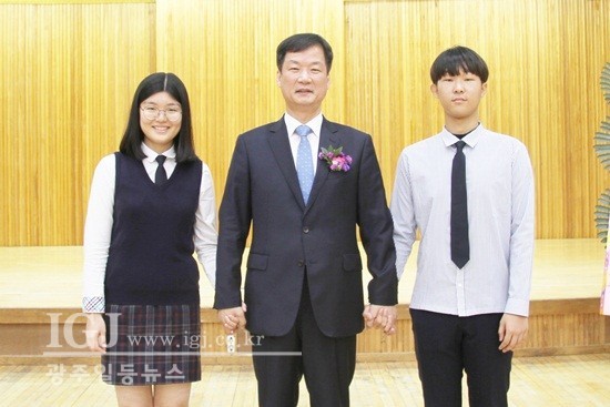 박균택 광주고등검찰청 검사장, 이서원 학생회장, 임상희 학생부회장은 송정중학교 자랑스런 동문 ‘박균택 광주고검장’과의 대화의 시간을 마친 후 "자랑스런 송정중학교가 될 수 있도록 최선의 노력을 다하겠다"며 기념촬영