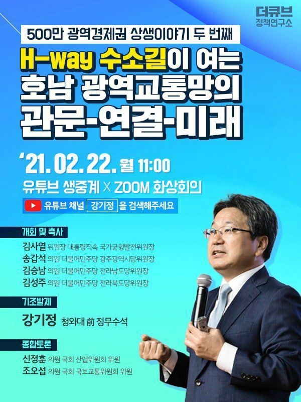 [광주일등뉴스=기범석 기자] 강기정 전 청와대 정무수석이 「500만 광역경제권」 상생이야기 두 번째로 ‘‘H-way 수소길이 여는 호남 광역교통망의 관문-연결-미래’에 대한 토론회를 갖는다.
