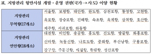 참여정부 시절인 2004년부터 추진하던‘중앙행정 권한 및 사무 등의 지방 일괄 이양을 위한 물가안정에 관한 법률’ 등 46개 법률 일부개정을 위한 법률(약칭: 지방 일괄 이양법)」이 올해 1월 시행됨에 따라 기존 해수부가 관리하던 통영항 등 17개 지방관리 무역항과 녹동 신항 등 18개 지방관리 연안항의 개발 및 운영권이 국가에서 시도로 권한이 이양됐다.
