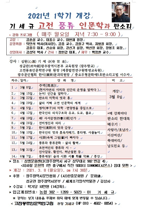 [광주일등뉴스=기범석 기자] 고전 풍류 인문학과 판소리를 함께 배울 수 있는 ‘기세규 고전인문학 강좌’가 3월 8일 개강한다.