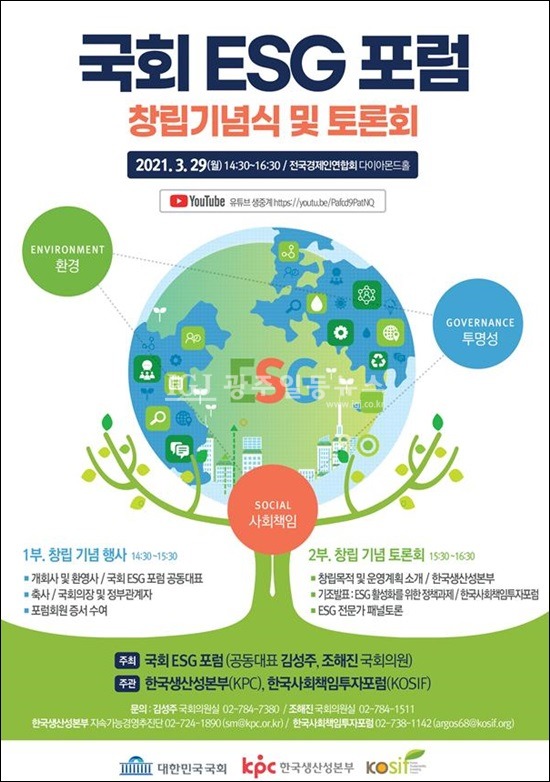 한편, 국회 ESG 포럼 발족식에서는 국내외 ESG 시장 동향을 살펴보고 우리나라의 ESG 정책 수립 방향과 과제 등을 논의하는 기념 세미나도 진행될 예정이다.