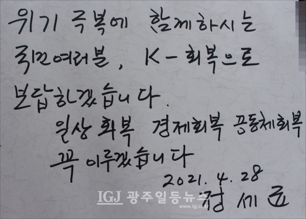 [광주인터넷뉴스=기범석 기자] 사실상 대권을 향한 시동을 건 정세균 전 국무총리가 광주를 찾아 “K-회복으로 보답하겠다”면서 “정권 재창출의 밀알이 되겠다”라고 대권 출마에 대한 강한 의지를 표했다.