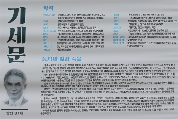 고 기세문 선생은 1934년 광주 광산구 임곡동(성내)에서 태어나 임곡초등학교(22회) 졸업 후 광주사범 부설중학교를 거쳐 광주사범학교를 졸업하고 교직 생활을 하던 중 통일운동에 나서 1956년 ‘조국평화통일동지회’를 조직하고 ‘평화통일선언문’을 발표해 2년간 옥고를 치렀다.