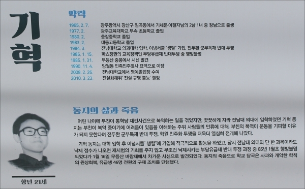 당시 전남대 의대는 한 과목이라도 낙제 점수가 나오면 재시험 없이 무조건 낙제시키는 학칙을 운영했는데 기혁 열사는 반대 투쟁을 벌이던 중 1985년 1월 초 행방불명됐다가 같은 달 16일 무등산 바람재에서 차갑게 굳은 시신으로 발견돼, 이후 1990년 광주 망월동 민족민주열사 묘역에 안장됐다.