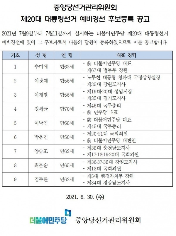 [광주일등뉴스=기범석 기자] 더불어민주당 중앙선거관리위원회는 6월 30일, 대한민국 제20대 대통령 선거에 나설 예비경선에 9명이 후보 등록했다고 공고했다. 관련기사 정세균 강경 “당 지도부 사과와 경선기획단 사퇴 요구”…"조치 없으면 특단의 대책 강구" 기범석 기자 gwangjuildeung@daum.net 다른기사 보기 저작권자 © 광주일등뉴스 무단전재 및 재배포, AI학습 및 활용 금지 개의 댓글 작성자 비밀번호 댓글 내용입력 댓글 정렬 최신순 추천순 답글순 BEST댓글 BEST 댓글 답글과 추천수를 합산하여 자동으로 노출됩니다. 닫기 더보기 댓글삭제 삭제한 댓글은 다시 복구할 수 없습니다. 그래도 삭제하시겠습니까? 비밀번호 댓글수정 댓글 수정은 작성 후 1분내에만 가능합니다. 본문 / 400 비밀번호 내 댓글 모음 닫기