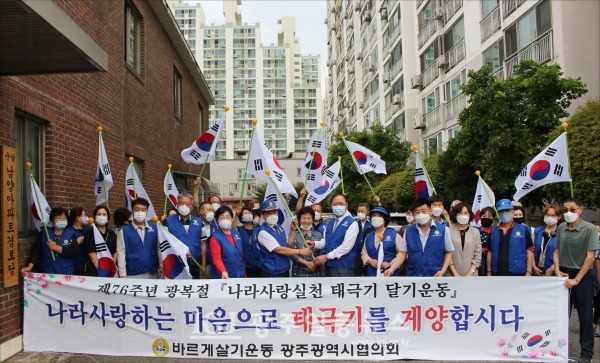 [광주일등뉴스=기범석 기자] 제76주년 광복절을 바로 앞둔 13일 바르게살기운동 광주광역시협의회(회장 구제길)가 광산구협의회(회장 김병우)에 태극기 800개를 전달했다.