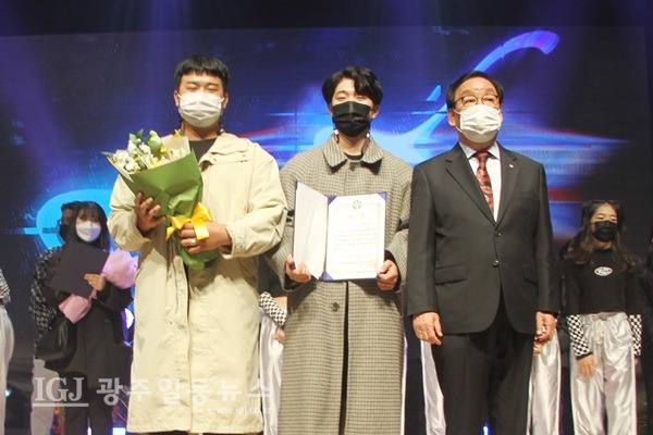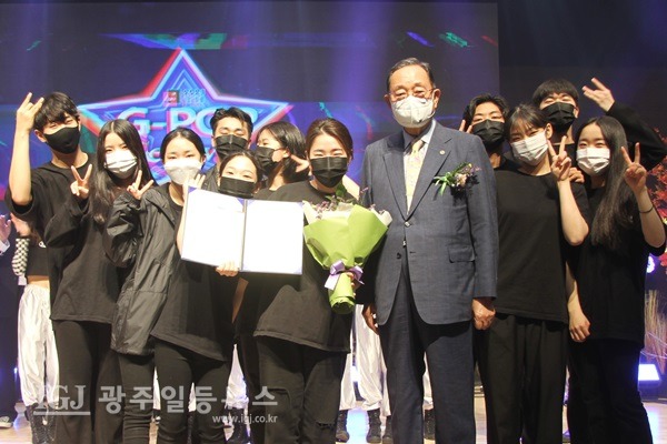 임원식 (사)한국예술문화단체총연합회광주지회장은 2021년 제9회 G-POP페스티벌에서 대상을 수상한 illbro 팀에 상장과 상금을 전달한 후 기념촬영