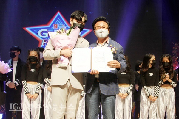 박용구 광주광역시사회복지심부름지원센터이사장은 2021년 제9회 G-POP페스티벌에서 은상을 수상한 김형환씨에 상장과 상금을 전달한 후 기념촬영