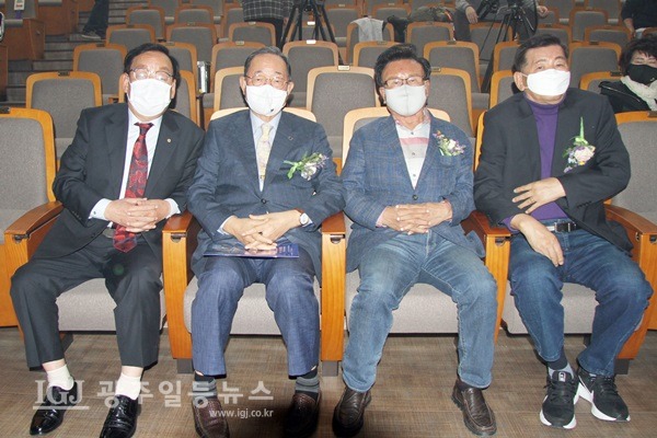 유방희 (사)한국연예협회광주전남지회장, 이용섭 광주광역시장을 대신해 임원식 (사)한국예술문화단체총연합회광주지회장, 박용구 광주광역시사회복지심부름지원센터이사장, 서동섭 부창건업주식회사기술이사는 2021년 제9회 G-POP페스티벌에 참가한 참가자들의 노래와 춤을 꼼꼼히 청취하며 응원하고 있다.