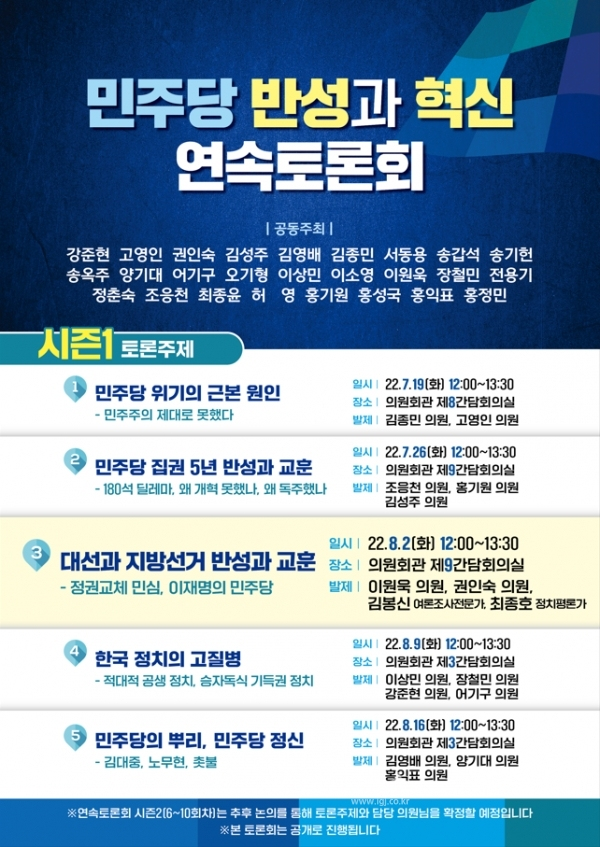 [광주일등뉴스=기범석 기자] 더불어민주당 국회의원 26명의 공동주최로 진행되는‘민주당 반성과 혁신 연속토론회’시즌1 세 번째 공개토론회가 오늘(8/2) 오후 12시, 국회 의원회관 제9간담회의실에서 개최된다.