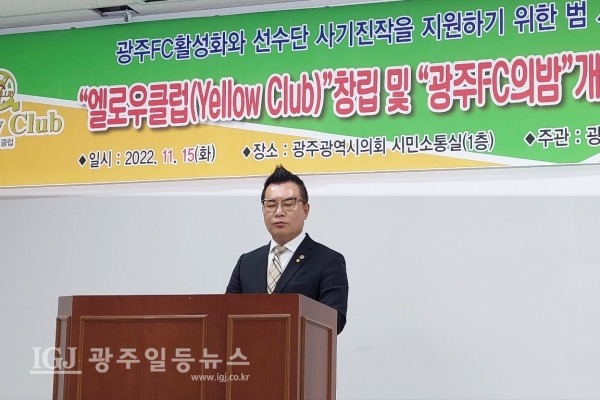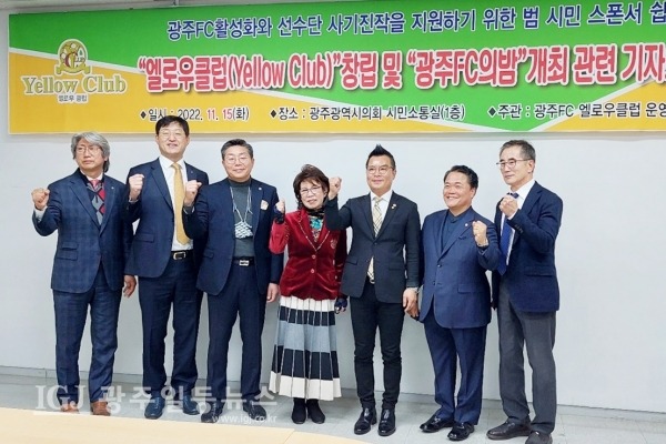 [광주일등뉴스=박부길 기자] 광주FC엘로우클럽운영위원회는 15일 오전 11시 광주광역시의회 시민소통실에서 광주FC활성화 선수단 사기진작을 지원하기 위한 범 시민 스폰서 쉽 ‘엘로우클럽’창립 및 광주FC의밤’ 개최 관련 기자회견을 가졌다.