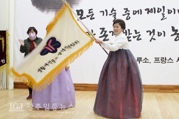제16대 정미자 (사)한국생활개선광주광역시연합회장은 연합회 기를 전달받고 힘차게 흔들고 있다.