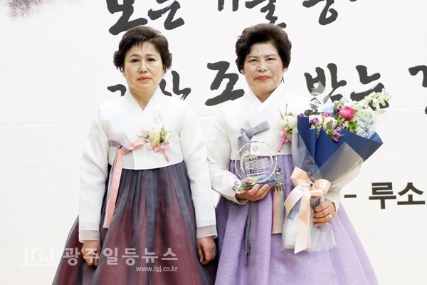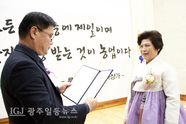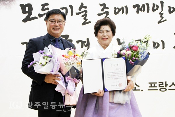 강기정 광주광역시장을 대신해 남택송 광주시생명농업과장은 남다른 애향심과 봉사자세로 지역사회 발전에 적극 협조했을 뿐만 아니라, 특히 지속적인 농촌여성의 지위 및 권익향상에 기여해 내일이 빛나는 기회도시 광주 건설을 위해 이바지한 공이 큰 변옥례 제15대 (사)한국생활개선광주광역시연합회장에게 감사패를 전수하고 있다.