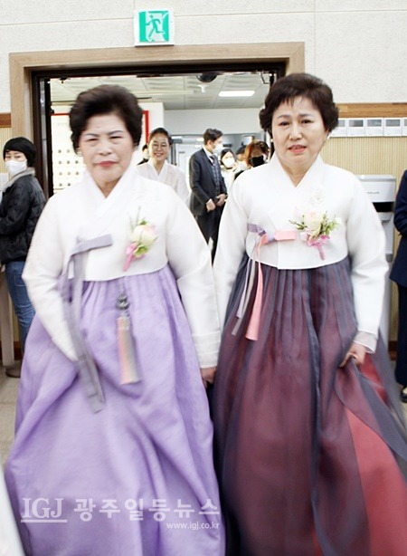 제16대 정미자 (사)한국생활개선광주광역시연합회장, 제15대 변옥례 (사)한국생활개선광주광역시연합회장은 이취임식 입장을 하고 있다.