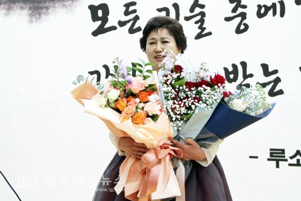제16대 정미자 (사)한국생활개선광주광역시연합회장은 취임 축하의 꽃다발을 받아들고 기념촬영
