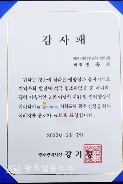 변옥례 제15대 (사)한국생활개선광주광역시연합회장은 남다른 애향심과 봉사자세로 지역사회 발전에 적극 협조했을 뿐만 아니라, 특히 지속적인 농촌여성의 지위 및 권익향상에 기여해 내일이 빛나는 기회도시 광주 건설을 위해 이바지한 공을 높이 평가 받아 강기정 광주광역시장 감사패를 수여 받았다.