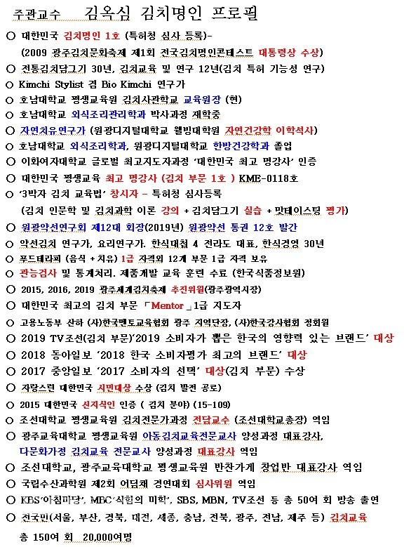 김옥심 호남대학교평생교육원 김치사관학교 주관교수는 대한민국 전국민의 큰 사랑을 받은 한食대첩4, KBS2 아침뉴스타임, SBS 좋은아침, MBC 생방송 오늘 아침' 등 다양한 방송 등을 통해 ‘광주. 전라도 김치의 맛과 멋’을 전국과 전 세계에 알려온 대통령상 수상자 김치명인이다.