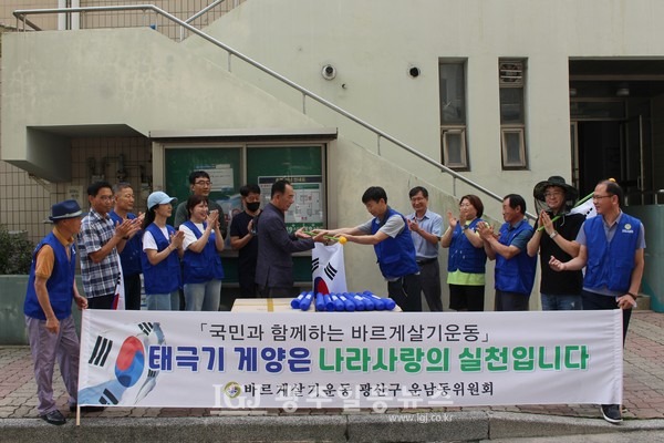바르게살기운동 광주 광산구협의회(회장 김병우) 운남동위원회(위원장 윤용조)는 8월 11일 아침 09시 30분부터 운남동 삼성아파트 관리사무소(소장 류왕목) 앞에서 삼성아파트에 태극기를 전달하고, 삼성유치원(원장 신정민)과 작은샘어린이집(원장 심연자) 어린이들을 위해 태극기를 전달했다.