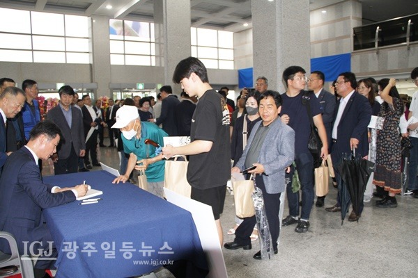 박균택 전)광주고등검찰청검사장(변호사)은 ‘박균택의 삶과 꿈, 그리고 광산이야기’ 책을 구입한 주민들에게 사인회를 갖고 있다.