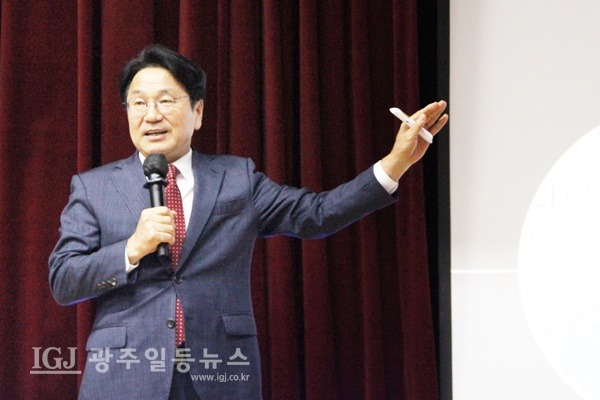 강기정 광주광역시장은 18일 오후 동구청 대회의실에서 열린 '동구 소통의 날' 행사에 참석해 시정 주요 현안에 대해 설명하고 있다.