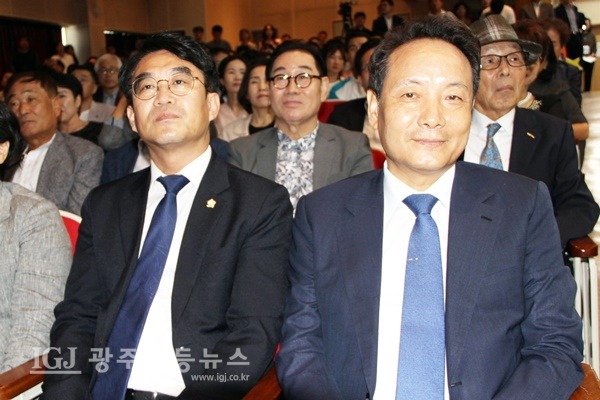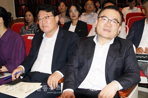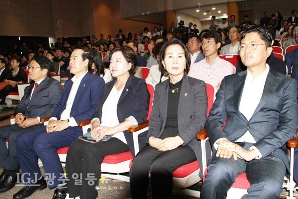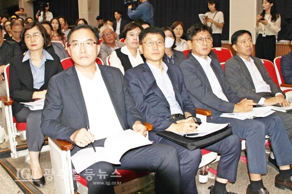 김준형 광주시신활력추진본부장, 김용승 광주시인공지능산업국장, 김요성 광주시문화체육실장, 전은옥 광주시자치행정국장, 최선영 광주시자치행정과장은 내일이 빛나는 자치도시 광주, 자치구 소통의 날 행사에 참석해 강기정 광주광역시장의 민선8기 시정방향 설명을 꼼꼼히 청취하고 있다.
