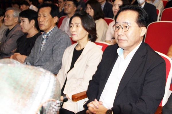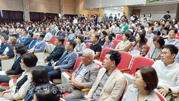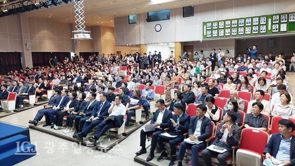 동구민들은 내일이 빛나는 자치도시 광주, 자치구 소통의 날 행사에 참석해 강기정 광주광역시장의 민선8기 시정방향 설명을 꼼꼼히 청취하고 있다.