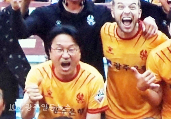 (오른쪽) 노희용 전)동구청장은 광주FC 구단주인 강기정 광주광역시장을 비롯해 역대 최다 응원단의 응원을 받으며 승리를 거둔 광주 FC선수들의 그날을 꼼꼼히 청취하고 있다.
