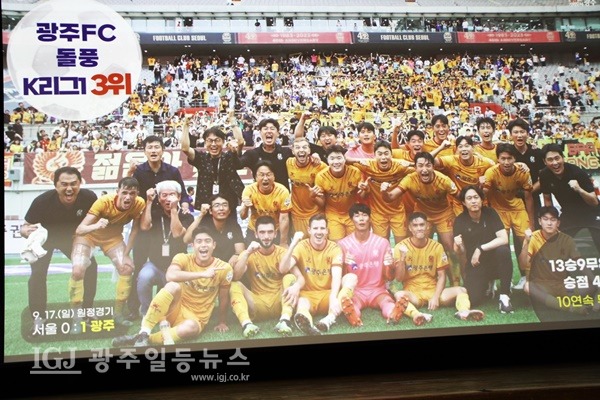 강기정 광주FC구단주(광주광역시장)은 광주FC는 서울과 하나원큐 K리그1 2023 30라운드 홈 경기에서  1-0 승리를 거둔 그 날을 동구민들에게 보고하고 있다.