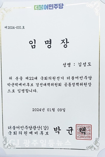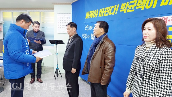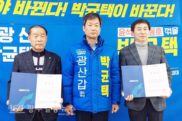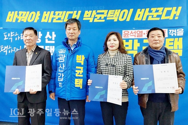 [광주일등뉴스=박부길 기자] 박균택 광산갑 국회의원예비후보(더불어민주당 이재명 대표 법률특보)는 9일 오전 10시 광주 광산구 사암로에 위치한 선거사무소에서 1호 공약 '광주 지하철 2호선 4구간 신설(송정역-선운지구-소촌동-우산동-월곡동-하남공단-수완동)에 대해 발표 및 경선대책위원회 공동정책위원장 임명장 수여식을 개최했다.