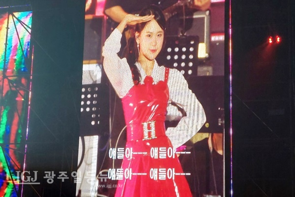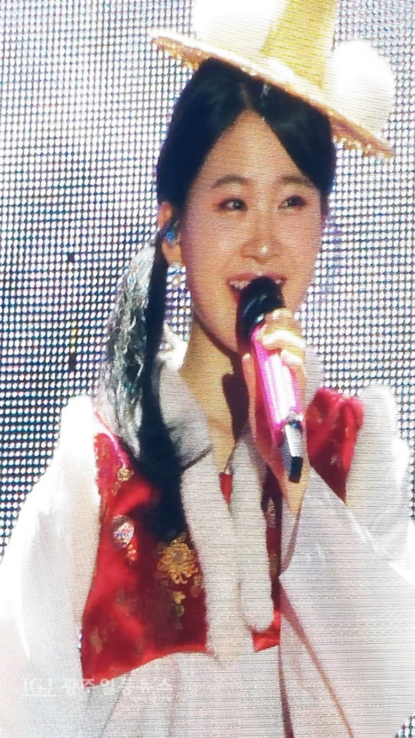 김다현 트롯가수는 '현역가왕' 광주콘서트에서 '못찾겠다 꾀꼬리'를 열창하며 관객들과 호흡하고 있다.