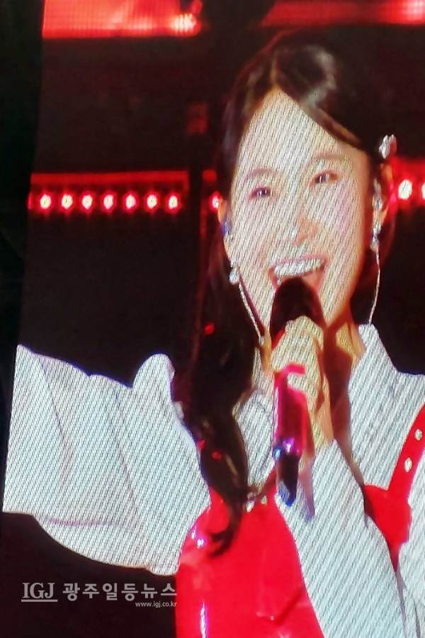 김다현 트롯가수는 '현역가왕' 광주콘서트에서 '노래하며 춤추며'를 열창하며 관객들과 호흡하고 있다.