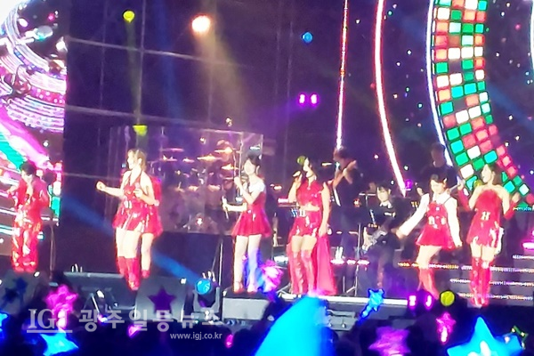 전유진-마이진-김다현-린-박혜신-마리아-별사랑은 '현역가왕' 광주콘서트에서 '못찾겠다 꾀꼬리'를 열창하며 관객들과 호흡하고 있다.