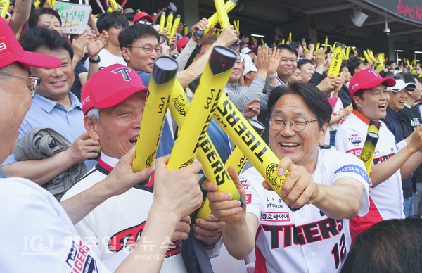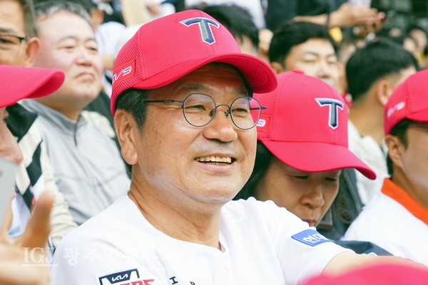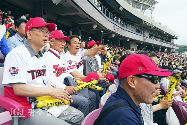 [광주일등뉴스=박부길 기자] 강기정 광주광역시장이 26일 오후 북구 광주기아챔피언스필드에서 열린 KIA 타이거즈와 두산 베어스의 경기를 시청 공직자들과 함께 관전하며 열띤 응원을 하고 있다.