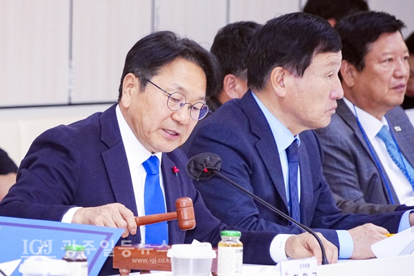 강기정 광주광역시장이 16일 오후 시청 중회의실에서 열린 ‘광주 2025 현대세계양궁선수권대회 및 세계장애인양궁선수권대회 조직위원회 창립총회’에 참석해 회의를 주재하고 있다.