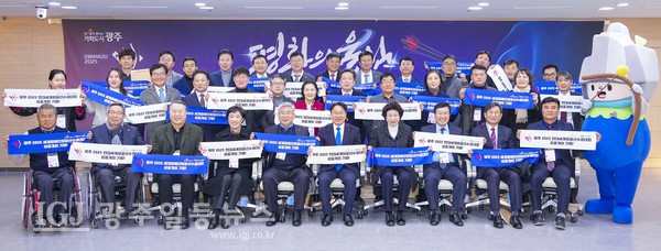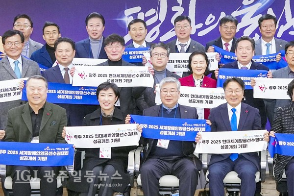 강기정 광주광역시장, 김병내 남구청장, 고병일 광주은행장, 전갑수 광주광역시체육회장, 신수정 광주광역시의회의장, 양진석 (주)호원회장 등 관계자들은 ‘광주 2025 현대세계양궁선수권대회 및 세계장애인양궁선수권대회 조직위원회 창립총회’에서 '광주2025 현대세계양궁선수권대회 성공개최 기원', ' 광주2025 세계장애인양궁선수권대회 성공개최 기원' 플랭카드를 들고 관계자들과 함께 퍼포먼스를 하고 있다.