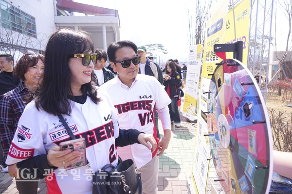 강기정 광주광역시장이 22일 오후 광주KIA챔피언스필드에서 열린 KIA 타이거즈와 NC 다이노스의 홈개막전에서 광주시 반값 대중교통 카드 G-패스 홍보관을 찾아 시민들과 룰렛이벤트에 참여하고 있다.