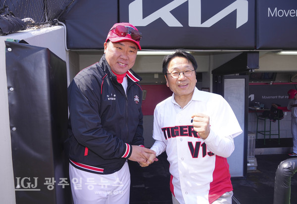 강기정 광주광역시장이 22일 오후 광주KIA챔피언스필드에서 열린 KIA 타이거즈와 NC 다이노스의 홈개막전에 참석해 KIA 이범호 감독과 승리를 기원하고 있다.