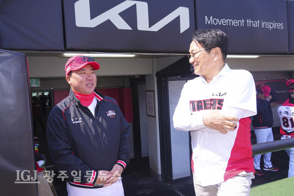 강기정 광주광역시장이 22일 오후 광주KIA챔피언스필드에서 열린 KIA 타이거즈와 NC 다이노스의 홈개막전에 참석해 KIA 이범호 감독과 승리를 기원하며 대화를 나누고 있다.