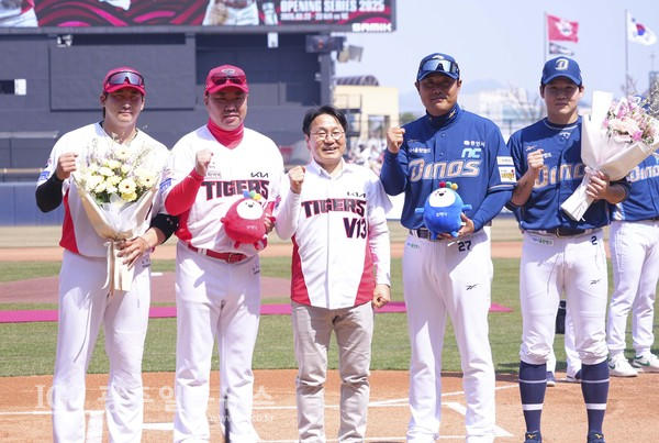 강기정 광주광역시장이 22일 오후 광주KIA챔피언스필드에서 열린 KIA 타이거즈와 NC 다이노스의 홈개막전에 참석해 KIA 이범호 감독, NC 이호준 감독에게 오매나 인형을 증정한 뒤 기념촬영을 하고 있다
