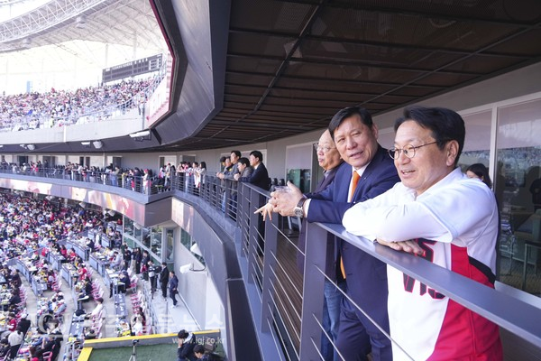 강기정 광주광역시장이 22일 오후 광주KIA챔피언스필드에서 열린 KIA 타이거즈와 NC 다이노스의 홈개막전에 참석해 허구연 한국야구위원회(KBO) 총재와 경기를 관람하고 있다.
