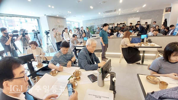 [광주일등뉴스=이은선 기자] 민선 8기 3주년 맞아 지난 6월 30일부터 7월 2일까지 '골목상권' 집중 현장 소통을 펼쳐온 박병규 광산구청장이 3일 오전 11시 광산구 백미옥 광주하남본점에서 기자간담회를 갖고 광산구의 지난 3년간의 성과와 향후 계획을 밝했다.