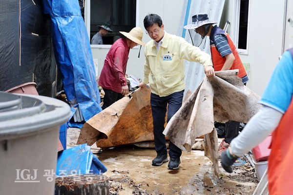 [광주일등뉴스=박부석 기자] 광주광역시 박병규 광산구청장이 20일 엄보현 광산구청자치행정국장 등과 함께 폭우 피해가 발생한 현장을 다니며 복구 상황을 점검하고, 피해 복구에 ‘구슬땀’을 흘리고 있는 자원봉사자들을 격려했다.
