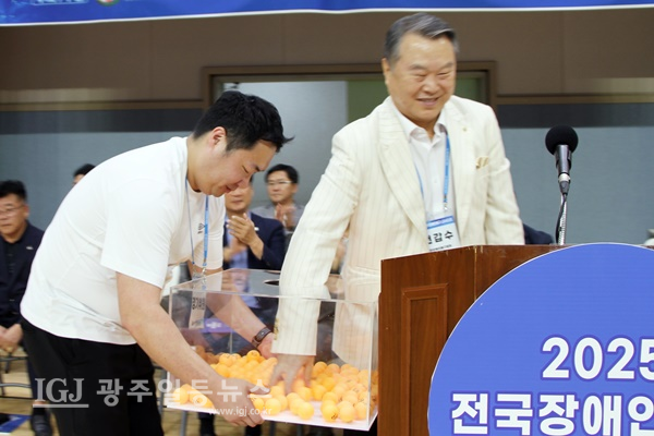 전갑수 대한장애인배구협회회장은 2025 전국장애인배구 리그전 개막식에서 행운권 추첨을 하고 있다.